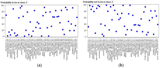 Affiliation chart for the second class of companies from the analyzed sample (a) The probability associated to a company to be integrated in class 2; (b) The probability associated to a company not to be integrated in class 2.
