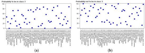 Affiliation chart for the third class of the companies from the analyzed sample. (a) The probability associated to a company to be integrated in class 3; (b) The probability associated to a company not to be integrated in class 3.