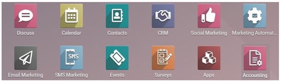 - Gómez-Llanez, C.Y.; Diaz-Leal, N.R.; Angarita-Sanguino, C.R. A Comparative Analysis of The ERP Tools, ODOO and Openbravo for Business Management. Aibi Rev. DeInvestig. Adm. E Ing. 2020, 8, 145–153. [Google Scholar] [CrossRef]