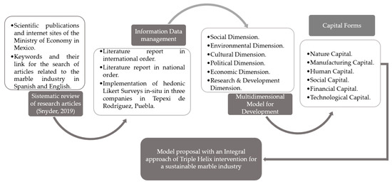 This research is based on the method of the Business Council (BS) for Sustainable Development (2002), and the framework is a diagnostic study of the context and the challenges of the Mexican marble industry in these dimensions: social, political, economic, cultural, environmental, research, and development. Thus, this article contributes a comprehensive management approach of three helices for the integration of forms of capital reported in the Mining, Minerals, and Sustainable Development (MMSD) project of 2006, and the Multidimensional Model proposed by [10], to synergize government, business, school, and society strengths, with the aim of transforming the marble industry sector in the following principles of sustainability. The integration of the strengths of the marble industry in the international arena under a comprehensive management approach of three helices—government–business–school—allows the experiences and knowledge related to the marble industry processes reported internationally to be aligned with the local experience where this comprehensive three-helix management (THM) approach is replicated. With this purpose in mind, the objectives of this article are the following: