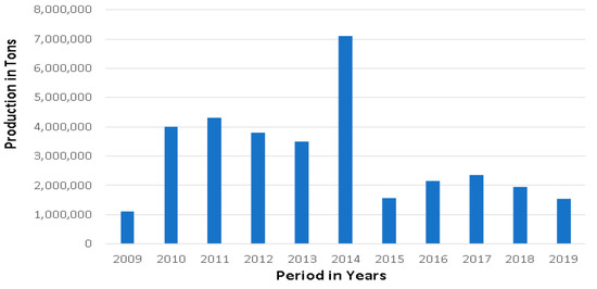 The reality faced by the marble mining sector in the international order, and its contrast in the national order, show similar scenarios. In Mexico and other parts of the world, the low efficient use of marble in its extraction and transformation processes [6], the damage to the health of workers and of local people in the community in this industry [25], and the high amounts of waste and sludge created [3] are among the most recurrent problems. To that effect, given the scenario of declining production shown by the industry in Mexico (Figure 3), several authors recommend improving the processes of marble extraction, transformation, and distribution.