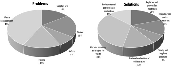 Table 2 shows that one of the problems of great concern in the marble industry in the international context is waste management; secondly, the low quality in the finishing process and the productivity related to the efficient use of raw and in-process materials are also concerning. On the other hand, as shown in Figure 4, in this industrial sector, job security is a large problem, yet it receives little attention in the industry: most of the proposals for improvement are frequently focused on reducing waste generated by this industry. Likewise, the least managed issues are those oriented to environmental safety, and the treatment of industrial effluents from this industry. Those problems raise the possibility of waste management and the treatment of its effluents from a circular economy approach. The proposed solutions show that they are focused, with greater importance, on addressing the problems related to occupational health and safety, as well as negative externalities caused by dust and environmental noise [4]. The waste generated by the marble industry—essentially pieces of laminated marble and sludge from marble cutting—have caused obvious environmental damage that range from changing the landscape [6] to impact on flora and fauna, in addition to the pollution caused by the emission of marble dust into the air, causing respiratory diseases [25]. Given the fact that these events have been reported in international articles [2], the authors recommend carrying out environmental performance evaluations and looking for alternative economies that are useful and marketable [4].