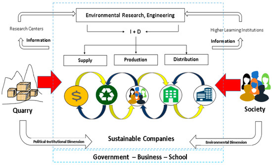 These findings highlight the importance of government–business–school conections to undertake improvements throughout the value chain in the marble industry. For this purpose, Figure 5 shows a comprehensive THI approach for the development of the sustainable marble company. This approach, based on a government–company–school relationship as an intervention manager, seeks to bring research centers and universities closer together to carry out research and the innovation of these processes throughout the supply value chain, including supply, production, and distribution. The improvement interventions in the marble industry supply chain are managed as capital reported by the MMSD project (2006), and the dimensions are oriented towards those of a sustainable company, as reported by [10]. In this THI approach, society has an important role in which permanent communication is maintained to assess the impact of the benefits and externalities caused by the marble industry.