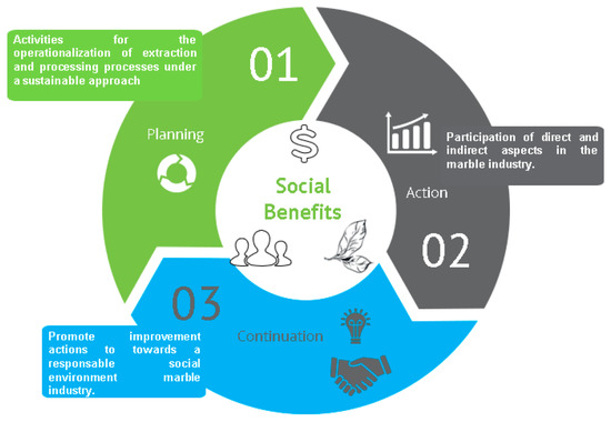 Figure 6 shows the three stages of the descriptive functional model. The planning phase, from a systemic approach, allows the comprehension of the context of the productive and environmental dynamics in the marble industry, leading it towards sustainability. In the next section, the action stage, the direct and indirect variables are fundamental so that the transformation, logistics, and service processes can generate social benefits with activities that elicit more efficient and productive dynamics, considering social and ecological implications. Based on the forgoing, the third phase of “continuation” emphasizes the universal measures that help to quantitatively assess the performance of the marble industry in regard to the labor, production, and environmental aspects, through a permanent evaluation in which indicators will be identified, managed, and referenced to ensure continuous improvement.