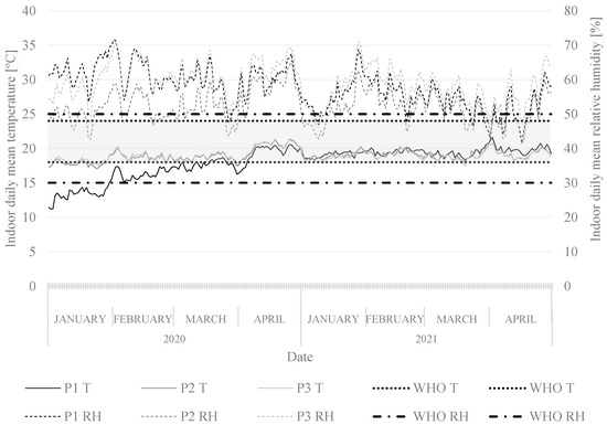 The analysed profiles present different situations in terms of temperature and relative humidity. While P1 is the profile with the lowest average temperatures in 2020, in 2021 it is P3 that has the lowest average temperature. However, P1 is the profile with the lowest measured temperature of 11.2 °C in January 2020, as shown in Figure 3.
