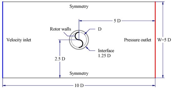 The blockage ratio is defined as the ratio between the cross-sectional areas of the model and the test section. In a two-dimensional analysis this can be simplified as the ratio between the diameter of the rotor and the width of the flow domain (), then the blockage effect can be also minimized by increasing the scale of the simulation domain with respect to the rotor size [24]; however, since this represents a greater requirement in computational resources, an optimal domain size is sought.