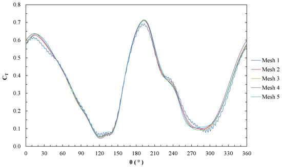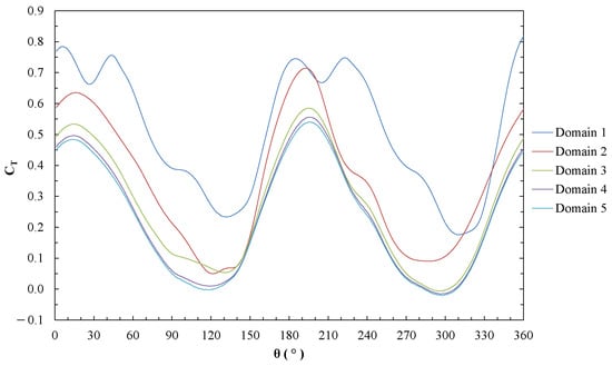 The results obtained in this analysis describe the behavior of the torque coefficient () according to the azimuth angle of the rotor () for each of the domains tested (Figure 3). is estimated as the ratio between the torque generated by the turbine on its axis and the torque that can be generated under the referred conditions [25,26]. This coefficient can be calculated by Equation (1), where is the air density, v is the wind velocity in free flow and is the transverse area of the turbine, H being the height of it (unitary in two-dimensional analysis).