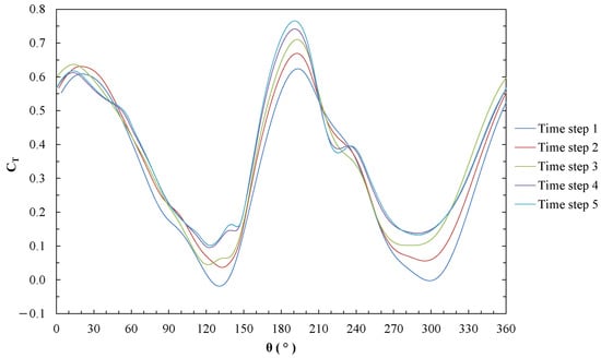 The independence analysis for temporal discretization was carried out in a similar way, under the same conditions and for the same geometry as the mesh independence analysis. Using the fourth mesh, five time discretizations were considered, generated by dividing the rotor revolution period into a number of elements or time steps. The results obtained in this analysis describe the behavior of the according to for each time steps used (Figure 6). When estimating the average value of for each temporal discretization, it is evident that its variation decreases as the partition becomes finer, getting closer and closer to a convergence value. A discretization of 720 time steps per revolution is determined, which represents a suitable ratio between the admissible error and the simulation time (Table 4).