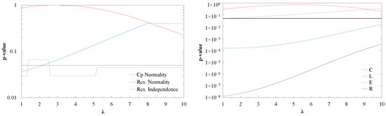 Since the calculated values do not fit a normal distribution, it is necessary to redistribute the data. For this, a power transformation is performed using data with a exponent, so that the transformed data meet the aforementioned conditions. Several power transformations are performed with exponents between 1 and 10, and for each one a second order multiple regression model with interactions is fitted [29]. When performing the hypothesis tests for each of the regression models, their verisimilitude is evaluated, establishing a confidence interval of 95% for compliance, which corresponds to a minimum significance level of 0.05. As observed in Figure 7 left, for an exponent of 2.5, the p-values of the tests are simultaneously greater than the established level of significance; therefore, the hypothesis that leads to the requirements compliance cannot be rejected. Likewise, the expression described in Equation (5) is established to transform the data, where is the transformed power coefficient.