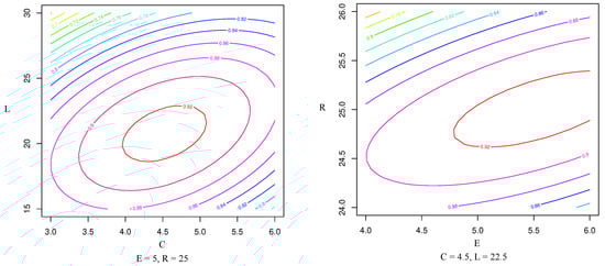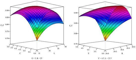 Factors C and L have the lowest p-values among the main effects, indicating that there is more evidence of having the greatest effect on the response variable. In the same way it happens with the interactions C:L, C:R and L:R, whose p-value close to 0, demonstrates the great dependence that exists between each pair of factors, in addition to their significance within the model. This result confirms the importance of analyzing the factors together in order to consider the variation of each one, with respect to the variation of a second factor. The quadratic effects of the L and R factors are also highly significant, indicating that their trend presents a curvature that must be taken into account in the fitted model and, therefore, validates the implementation of the second order model.