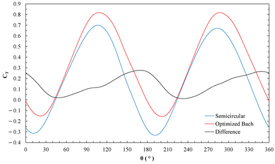 Difference between the torque coefficient () of the conventional semicircular profile and the optimized Bach, at a of 1.0996.