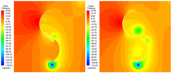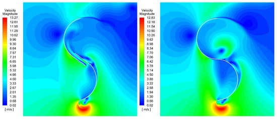 In the contour graphs, the pressure and flow velocity states are shown through the studied geometries. These are aligned in the position where the greatest difference in the performance between the two rotors is appreciated. It is evident that the pressure on the concave side of the advancing blade is higher for the optimized profile (Figure 11 left) than for the reference profile (Figure 11 right). This is due to the fact that the existing flow through the opening generated by the division of the profile (Figure 12 left) avoids the early depressurization of the referred region, and consequently increases the moment produced in the rotor axis, in addition to enabling to get a higher turning velocity [32]. Similarly, it can be found that in the semicircular profile there is a region of higher velocity in the concavity of the returning blade (Figure 12 right), which is caused by the vorticity that is generated in this area. This higher velocity induces a lower pressure and also generates a greater resistance to blade movement.