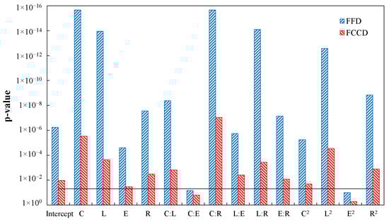 However, the optimal points estimated using the regression models for each of the designs show significant differences, mainly in C and E factors. Likewise, by simulating the geometries built from these optimal parameters, the FFD presents a more favorable performance result, which leads to a greater acceptance of this model for the purposes of this research. On the other hand, although the goodness of fit seems significantly higher for the FCCD with a difference of 7.58% in the value of , the adjusted is only 2.21% higher, which reveals a greater effect of the factors on the response variable in the FFD rather than in the FCCD. This can be verified in Figure 13, where a supremacy in the scale of the effects of each of the factors and their interactions is identified, indicating that it is possible to capture more information from the data in the first design than in the second one. This may be the root cause of optimal point prediction in the FFD being more accurate.