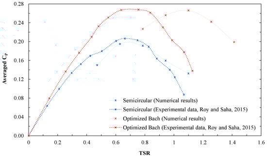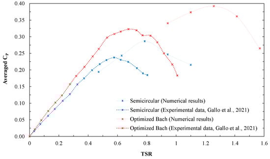 Figure 14 and Figure 15 show that the results obtained from the numerical study, are adjusted to the order of magnitude of the experimental data for the two types of profile [12,33]. The main difference occurs in the rate of rotation in which the Bach type profile reaches its maximum performance, which may be due to the fact that the inertia of the system is not considered in the numerical analysis, in addition to the other causes of error specific to each of the approaches.
