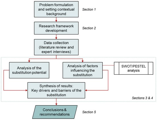 The article is organized into five sections. Section 1 provides the theoretical and contextual background. Section 2 presents the scope and methods of the study. Section 3 presents the results of the substitution potential and the SWOT/PESTEL analysis. Section 4 discusses the main drivers and barriers to the substitution. Lastly, Section 5 defines the conclusions of the study and provides recommendations for future research.