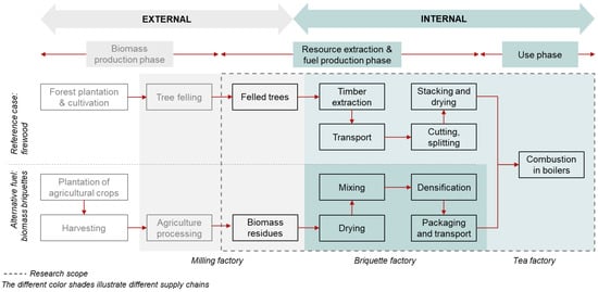 The study scope was set within the value chain of firewood and biomass briquette production (Figure 2). This chart was used as an orientation to determine the internal and external factors of the substitution.