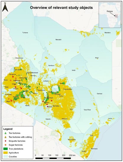 The study was conducted at the country level. A map (Figure 3) was created by plotting the location data of biomass briquette factories, tea factories, and sugar factories to provide an overview of the geographical information. Only a limited number of briquette factories are shown on the map as the data are scarce. Information on agricultural land and tree plantations is included in the map. The data used to plot the map are provided in the Supplementary Materials.