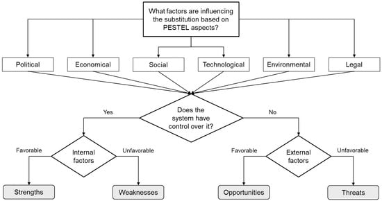 The combination of SWOT and PESTEL analyses allows for a more thorough and more accurate analysis of a complex system and its multidimensional interactions with the environment [35]. Even though the initial purpose of PESTEL analysis was to comprehend the macro environment of the substitution, the expert interviews revealed that the PESTEL categories were also reflected within the internal factors. Applying a PESTEL analysis to both internal and external factors has been shown in a case study of reconstructing a water intake structure [35]. The SWOT/PESTEL analysis in this study followed the algorithm as illustrated in Figure 4.