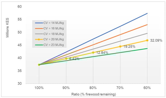 This study examined the production capacity and product prices, excluding tax and other costs, based on the data from the literature [7,10] and interviews with briquette producers. The exclusion of other costs was due to the variance of delivery costs and the data scarcity. A sensitivity analysis of the costs of adopting briquettes at different substitution rates in the tea factories and different CVs was conducted. CV is a sensitive parameter to the costs; the higher the CV of briquettes, the more competitive briquettes are to replace firewood as there will be more energy that can be delivered. The sensitivity analysis was carried out to show the importance of having a more standardized CV for briquette products so that the amount of energy to be delivered by briquettes can be ensured. The CV variation was based on the existing data in the literature [24] and the value reported by the briquette companies interviewed for the study (Table A4).