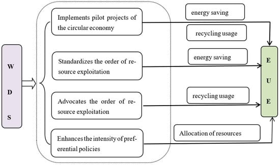 As presented in Figure 1, the direct impact of the WDS on energy utilisation efficiency benefits from the institutional advantages and policy benefits of the strategy. That is, the WDS implements pilot projects of the circular economy, standardises the order of resource exploitation, advocates the order of resource exploitation, and enhances the intensity of preferential policies.
