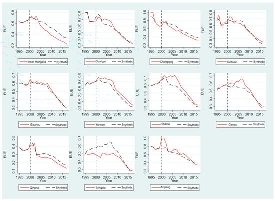 Figure 3 presents a comparison of the actual and synthetic energy utilisation efficiency levels in the provinces where the WDS is implemented. The vertical dashed line represents the beginning year of the strategy implementation, the solid line represents the actual change trend of the energy utilisation efficiency in different provinces of the western region, and the dashed line indicates the changing trend of the synthetic energy utilisation efficiency. Based on the fact that there are great deviations between the actual and synthetic energy utilisation efficiency in Chongqing, Sichuan, Guizhou, Ningxia, and Xinjiang before the strategy implementation, it cannot satisfy the premise of the parallel trend hypothesis of the synthetic control method. In contrast, Inner Mongolia, Guangxi, Yunnan, Shaanxi, Gansu, and Qinghai had a better fitting effect on the actual and synthetic energy utilisation efficiency before the strategy implementation. Therefore, a follow-up study made a detailed analysis of the WDS in the six provinces.