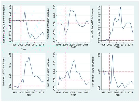 As shown in Figure 4, the solid line demonstrates the changing trend of the gap between the actual and synthetic energy utilisation efficiency in the provinces where the WDS is implemented, i.e., the net effect of the WDS. Before the implementation of the strategy in 2000, the solid line fluctuated around 0, which denotes that the synthetic control groups of those six provinces are in line with the actual values. Following the strategy implementation in 2000, the fluctuation range of the solid line became larger, showing an upward trend at first and then a downward trend, signalling that strategy implementation plays a positive role in improving the energy utilisation efficiency of the western region. However, the net effect of the strategy declines with time. Specifically, the actual energy utilisation efficiency of Inner Mongolia, Guangxi, and Qinghai lags behind that of synthetic provinces in the initial stage of the strategy implementation and then significantly improves, surpassing that of synthetic provinces. With time, the implementation effect of the strategy declines, and the actual energy utilisation efficiency falls behind that of synthetic provinces. The real energy utilisation efficiency of Shaanxi Province lags behind that of synthetic provinces after 2013, that is, 13 years after the WDS implementation. The real energy utilisation efficiency of Yunnan and Gansu has been higher than that of synthetic provinces since the strategy implementation. It demonstrates that the WDS significantly boosts the energy utilisation efficiency. Based on that observation, Hypothesis 1 has been verified.