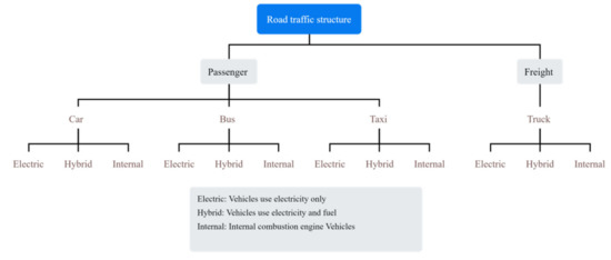 where represents the different types of vehicles; is the product of passengers and the annual kilometers of vehicles (the unit is passenger·km); is the product of the vehicle ownership and the annual kilometers of the vehicles (the unit is billion vehicle·km); and is the energy intensity of the current vehicle, which represents the ability of the vehicle to consume energy (the unit is L/passenger·km). When calculating a model for new energy vehicles that use electricity as the power source, it measures in different units (kw·h/passenger·km); is the fuel economy of the vehicle and the unit is vehicle·km/L. When calculating a model for a new energy vehicle with electricity as the power source, it measures with different units (vehicle·km/kWh); is the loading factor and the unit is passenger·km/vehicle·km. When calculating a model for a freight car, it uses different measurement units for (tonne·km/vehicle·km).