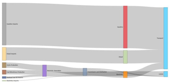 As shown in Figure 3, taking the baseline scenario as the standard, the road traffic energy of Chengdu was represented by a Sankey diagram through the LEAP model simulation analysis. The energy input of the road transportation of Chengdu came from hydroelectric power generation, coal-fired power generation, oil-fired power generation, externally transferred power, gasoline imports, and diesel imports. From the structure, we found that the electricity of the power plant was lost to a certain extent during the transmission process; most of the remaining power and externally transferred power entered the transportation energy. Gasoline energy input accounted for most of the energy sources; the rest were diesel, hydroelectric power, thermal power, and power transfer, in descending order.