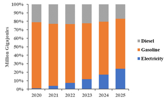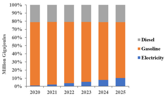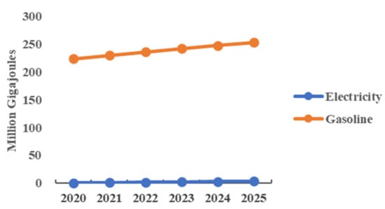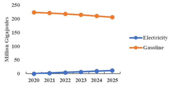 Due to the increase in the number of motor vehicles, the energy demand for small cars (integrating private cars and taxis) in the LC scenario gradually increased and gasoline and electricity linearly increased by a significant amount and whilst new energy vehicles were being developed, internal combustion vehicles were not restricted. As can be seen from Figure 6, from 2020 to 2025, the energy demand for gasoline increased from 223.6 million GJ to 253.1 million GJ (i.e., by 13.19%), and the energy demand for electricity increased from 0.6 million GJ to 3.7 million GJ (i.e., 5.1 times the initial value). The electricity demand of cars only accounted for a small part of the whole and the main energy demand was still from gasoline.