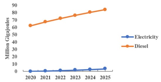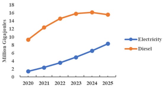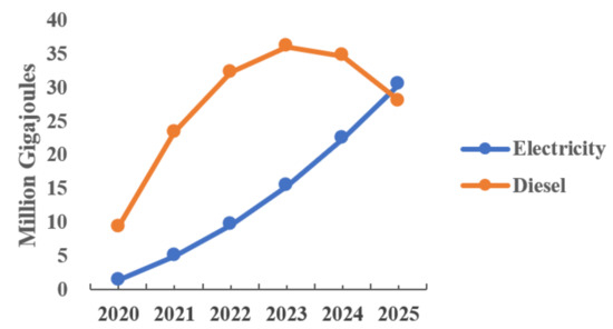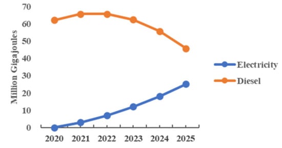 The energy demand trend of trucks in the LC scenario was similar to that of cars because the proportion of new energy vehicles in the original structure was relatively small. The LC scenario was based on natural growth and did not impose mandatory measures on the energy structure of trucks and cars. As shown in Figure 10, from 2020 to 2025, the diesel energy demand increased from 62.3 million GJ to 84.2 million GJ, which was 35.1%; the electric energy started to emerge in 2021 and increased to 3.4 million GJ by 2025, an increase of 36% per year. According to the trend in Figure 10, trucks did not achieve a balance between fossil energy and clean energy under the LC scenario.