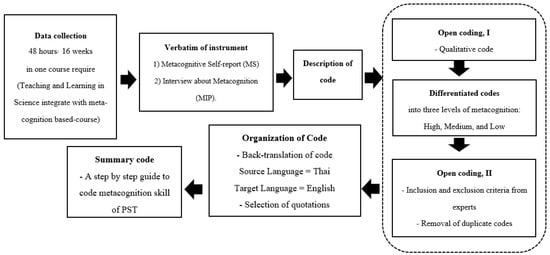 Although qualitative instruments are important in studying metacognition when deriving data, the qualitative analysis of metacognition is also very difficult. There was a lack of a coding scheme for analyzing data about metacognition. From the literature review, two studies dealt with the coding of metacognition [42,43]. However, no study proposed a coding scheme and the differentiation of metacognitive levels among the codes. This study, therefore, aimed to develop a coding scheme of PSTs’ metacognition (CSPM). This study focuses on three research questions: