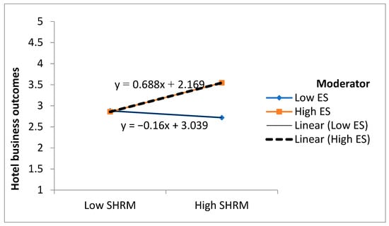 The ES moderates the influence of SHRM practices and the hotel business outcomes. As the ES becomes stronger, a positive impact of SHRM practices on hotel business outcomes is significant.