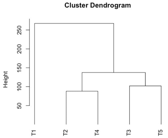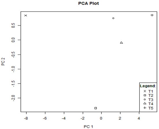 UPGMA analysis grouped treatments T2 and T4 together as a single group. Treatments T3 and T5 were also grouped together in the same way (Figure 1). As seen in the Figure, the treatments with bioinoculants (T1) and (T2) were significantly different from one another (T3, T4 and T5) (Figure 1). In addition, the PCA was utilized to assess differences between treatments and investigate relationship-based clustering. The cluster analysis revealed that the treatment T1 was distinct from the other treatments in the study (Figure 2). The figure shows that samples corresponding to the first two principal components (PCs) exhibited a solid propensity for segregation (70.22% of the total variance; Figure 2). Whereas the correlations among the different traits are provided in the Figure S1 and Figure S2, respectively.