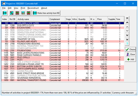 In this way, we gradually refine the model of the course of construction and thus obtain a more accurate picture of the need for resources in real time and the price of the project implementation and its time course, which is determined by calculating a network graph. While respecting the above fact, it is possible to determine, during about 2 h of work, the price of the realization of the project with a deviation of about 5–8% (according to the level of documentation available at the time of creating the model of project implementation) compared to the classic calculation using a program that would last about 2–3 days. The listing of the part of the model with the Pareto activities marked in pink is shown in Figure 1.