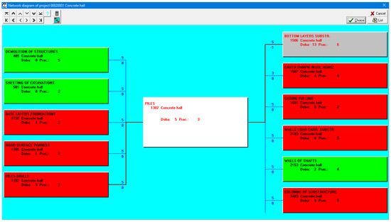 The user can, of course, modify the model network graph according to the conditions of the project in terms of its structure, ambient conditions, and links. Part of the network graph around a certain monitored process can be viewed on the screen with the so-called main links, which are crucial for calculating the terms of the monitored process, and this is shown in Figure 2. Critical activities are marked in red and activities with time reserve are marked in green. The main links are highlighted with brown lines. The numbers above the dark blue and brown lines showing the links indicate the type of link and their specific value (lag time, working space index, or partial link factor).