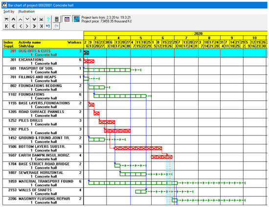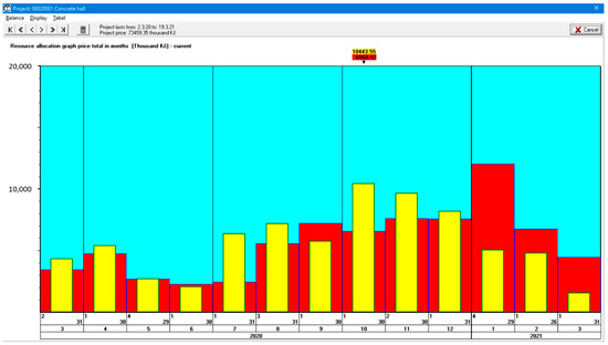 The system also allows you to perform the so-called harmonizing of the network graph, which is a calculation of the number of workers in construction processes with respect to a given date of project completion. After this calculation, the calculated data on the construction period and construction price will appear and it is possible to list the technological analysis schedule, including the main links (see Figure 3), and overviews of the resource allocation of monitored resources, including the number of employees and construction financing (cash flow) in real time (see Figure 4), and possibly to draw a line-of-balance of the construction process. In the schedule in Figure 3, the activities on the critical path are marked in red, the activities with a time float in green, and the delayed activities in blue. The blue or red vertical arrows show the main links of the network graph. In the resource allocation graph of financial needs in Figure 4, the values resulting from the early terms are marked in yellow, and the values resulting from late terms are marked in yellow. Of course, there is a cumulative form of the resource allocation graph for countable resources.