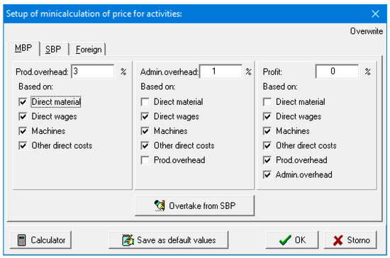 The system is equipped with a so-called mini-calculation, which allows the determination of a different calculation formula for calculating the price of each modeled building. At the same time, the user can set his own percentages of indirect costs (production and administrative overheads) and profit, seen in Figure 5, and then recalculate the final cost of construction. This is very important for answering the first question presented in the Introduction. The user can enter the minimum overhead (not zero) and zero profit, then reduce the calculated price by a percentage of discounts on materials or wages, and after recalculating the model, the user obtains the limit of unreasonably low price.