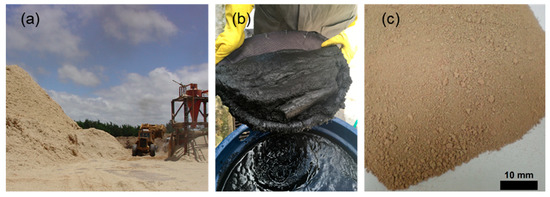 Sugarcane bagasse ash (SCBA) was collected from the ash collector in a Brazilian sugarcane plant in Rio de Janeiro State, Brazil. The ash was obtained from the uncontrolled burning of sugarcane bagasse (Figure 1a) in boilers at temperatures around 800 °C. The as-received SCBA was treated with densimetric fractionation [30] (Figure 1b) and autogenous recalcination [45] processes that reduced the contaminant content, resulting in ash with good pozzolanic activity, a high specific surface area, and adequate chemical and mineralogical compositions, as shown in Table 1 and Figure 2, respectively. Figure 1c shows the SCBA after grinding.
