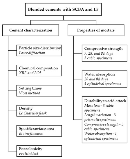 - With respect to durability tests, blended cements showed good performance compared to the reference. Cements containing LF exhibited excellent mass loss and water absorption, while SCBA provided lower length variation and good mechanical behavior after the sulfuric acid attack. The combined effect of these materials was evident in ternary mixes, which displayed good durability, with little mass and length variation, and good mechanical performance after the attack.