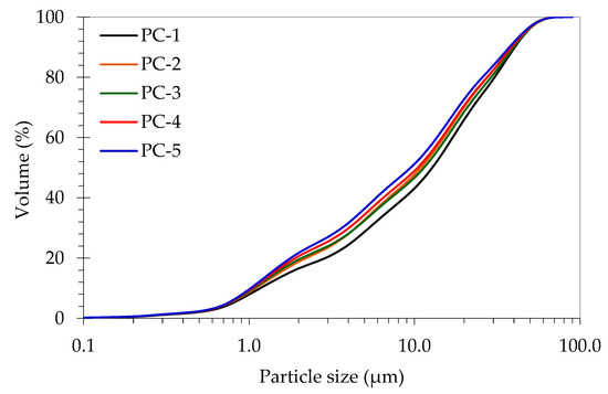 The addition of SCBA and LF slightly changed the physical properties and chemical compositions of blended cements compared to the reference, as presented in Table 3. As expected, incorporating SCBA increased the silica content of blended cements but also raised the cement alkaline equivalent (Na2Oeq), increasing the expansion potential via the alkali–silica reaction in concretes [59]. Both SCMs increased the loss on ignition of blended cements, especially LF, due to its carbonate composition. The particle size distribution (Figure 4) of all the cements was very similar, allowing them to be compared. However, the incorporation of ultrafine SCBA and LF resulted in lower density and higher Blaine fineness of blended cements compared to PC-1, especially with SCBA because of its high BET specific surface area.