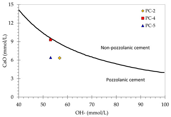 The setting times of blended cements were also influenced by SCM incorporation (Table 3). While SCBA increased the initial and final setting times of PC-2 compared to PC-1, the opposite was observed for PC-3, since LF shortened the final setting time. These effects were observed in other studies with SCBA and LF, separately. The hydration delay promoted by SCBA is related to the presence of contaminants [30,34,60], such as carbonaceous compounds (3.9% LOI) and SO3 (Table 1) in the ash. On the other hand, the acceleration provided by the ultrafine LF can be attributed to the extra surface area for hydrate nucleation [40,61]. A combination of these effects was observed in the ternary mixes, with a slight increase in the initial setting time of both PC-4 and PC-5 compared to the reference, and the final setting time of PC-5 because of its higher SCBA content compared to PC-4. Nevertheless, the setting times of all blended cements were in accordance with the Brazilian standard for blended Portland cements [62]. Moreover, Figure 5 shows the results of the Frattini test, which indicated that all cements with SCBA (PC-2, PC-4, and PC-5) were classified as pozzolanic Portland cements. This result may be associated with good pozzolanic activity and the large specific surface area of SCBA [20,22,23].