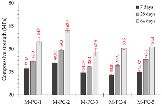 Figure 6 presents the average compressive strength for three specimens of each mortar after 7, 28, and 84 days of curing. According to the results, M-PC-2 showed significantly higher strength than that of the other mortars at all ages. In the present case, the heterogeneous nucleation and pozzolanic effects of SCBA were more effective and significant than the dilution effect of clinker replacement in PC-2, a finding also reported in previous studies [27,34]. On the other hand, the isolated effect of LF in PC-3 was negative for mortar mechanical behavior, since M-PC-3 exhibited significantly lower compressive strength than that of M-PC-1 at all ages and the worst result between all the mortars at 28 and 84 days of curing. The lower compressive strength of M-PC-3 was related to the dilution effect [40,43,44]. As expected, the ternary mixes (M-PC-4 and M-PC-5) showed intermediate results compared to their binary counterparts. The compressive strength of both ternary mortars at 7 days was affected by the high clinker replacement content in PC-4 and PC-5 cements. However, increases in strength were observed in these mortars with long-term curing, especially due to the pozzolanic effect of SCBA. At 28 days, no significant difference was observed in the compressive strength of M-PC-5 and M-PC-1. The LF effect was more pronounced in M-PC-4, which displayed lower strength than M-PC-1 and M-PC-5.