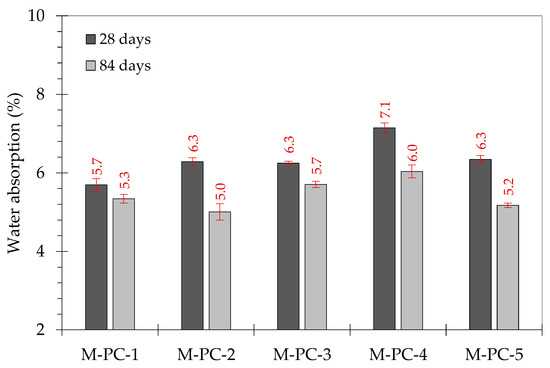 Figure 7 presents the results of water absorption (average of four specimens) after 28 and 84 days of curing. An increase in water absorption was observed for all blended cements compared to the reference at 28 days. However, at 84 days of curing, there was a significant reduction in the water absorption of all the cements related to the previous age, especially for the blended varieties. These results indicate a better effect of SCM at later ages, particularly SCBA because of its pozzolanic activity, which causes gradual pore closing [63,64]. In our case, M-PC-2 exhibited higher water absorption than that of M-PC-1 at 28 days, but after 84 days the binary mix showed significantly lower absorption. On the other hand, LF increased the water absorption of M-PC-3 compared to the reference at both ages because of the ultrafine particles used in the study. The behavior of ternary mixes was similar to that of the binary mortars. While M-PC-4 obtained an increase in absorption owing to the higher LF content, M-PC-5 exhibited a decrease, caused by the higher SCBA content. Furthermore, no significant differences were found between M-PC-5, M-PC-1, and M-PC-2 at 84 days.