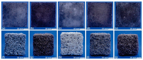 M-PC-1 (a), M-PC-2 (b), M-PC-3 (c), M-PC-4 (d), and M-PC-5 (e) before sulfuric acid exposure; M-PC-1 (f), M-PC-2 (g), M-PC-3 (h), M-PC-4 (i), and M-PC-5 (j) after 56 days of sulfuric acid exposure.