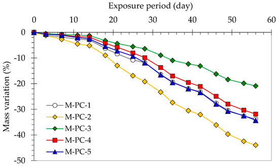 In this context, the degradation of mortars caused by sulfuric acid attack resulted in mass loss in all the specimens, as shown in Figure 9. M-PC-3 showed better behavior due to the presence of LF. The calcite from LF reacted with the sulfuric acid, protecting the mortar against C–S–H decalcification and enhancing its capacity to neutralize the acid [66,67]. On the other hand, M-PC-2 exhibited the highest mass loss among the mortars studied, including the reference, as previously observed in visual inspection. After 56 days of exposure, the mass loss for M-PC-2, M-PC-1, and M-PC-3 was 43.9, 33.8, and 20.9%, respectively. These results suggest that CH consumption by the pozzolanic reaction of SBCA was not enough to improve the durability of this mortar to sulfuric acid attack, despite the good mechanical behavior of M-PC-2. Similar findings were reported by Senhadji et al. [44] in mortars containing silica fume. A more in-depth investigation on the mechanisms of sulfuric acid attack is needed to better understand the influence of SCBA on the durability properties of cementitious material. Ternary mixes displayed intermediate behavior compared to their binary counterparts and results very similar to those of the reference. At the end of the attack, M-PC-4 and M-PC-5 showed 31.8 and 34.3% mass loss, respectively, which confirmed the positive effect of adding LF to these mortars.
