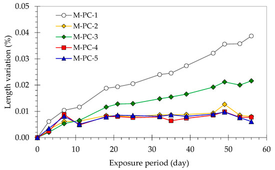 As expected, expansion trends were observed in all mortars during 56 days of exposure, as presented in Figure 10. The four mortars with blended cements had significantly lower expansion than that of the reference, indicating better mortar performance with SCBA and LF during the sulfuric acid attack. At the end of the exposure period, M-PC-1 showed 0.039% expansion, while M-PC-2, M-PC-3, M-PC-4, and M-PC-5 obtained 0.022, 0.008, 0.008, and 0.006%, respectively. Unlike the mass variation results, the mortars containing SCBA (M-PC-2, M-PC-4, and M-PC-5) showed the best length variation results, probably due to pozzolanic reactions, and their expansion values were considered non-significant according to ASTM C1012-18b [58].