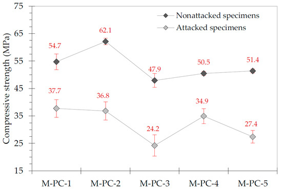 Average compressive strength of attacked and nonattacked mortars at 84 days.