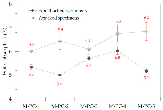 Average water absorption of attacked and nonattacked mortars at 84 days.
