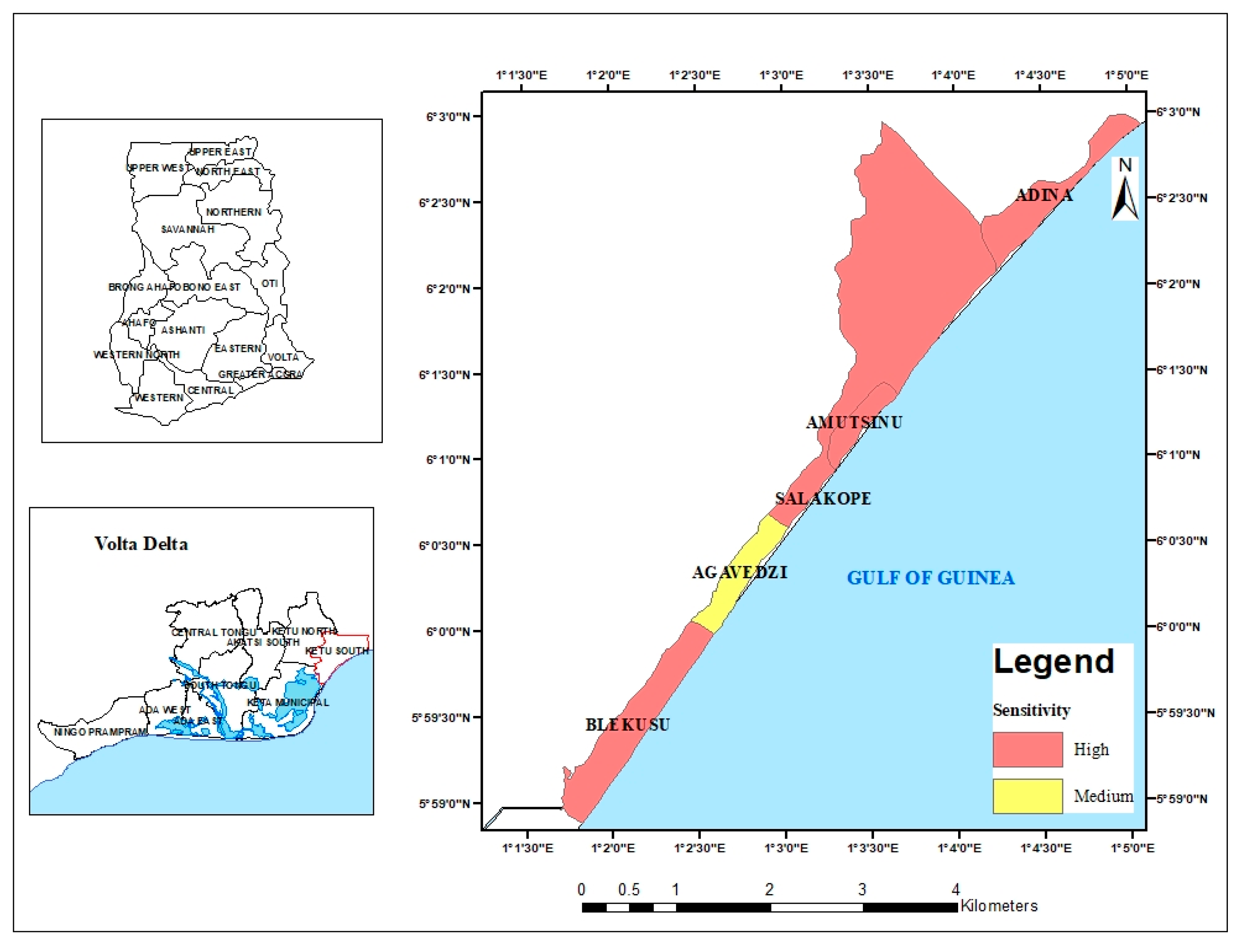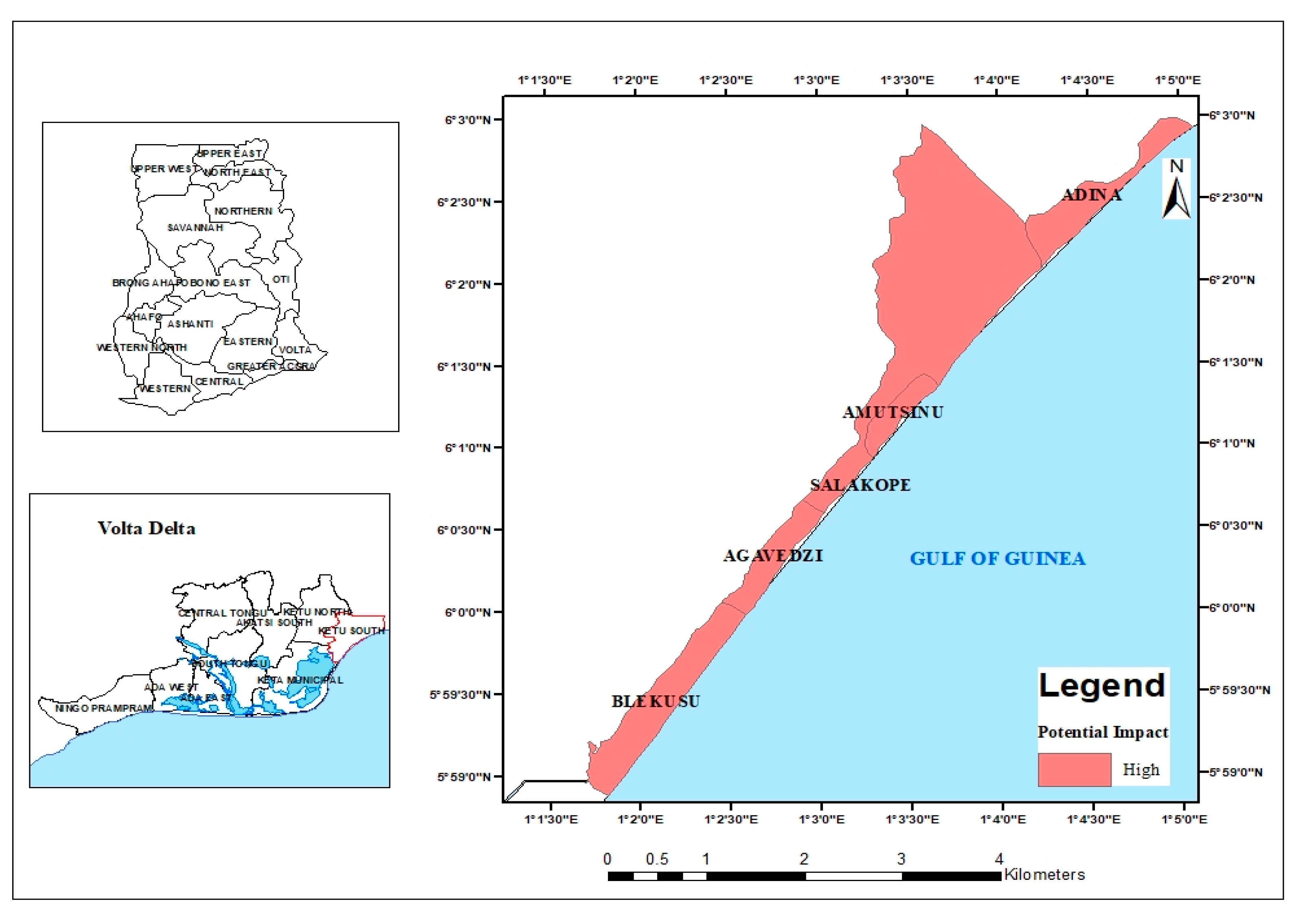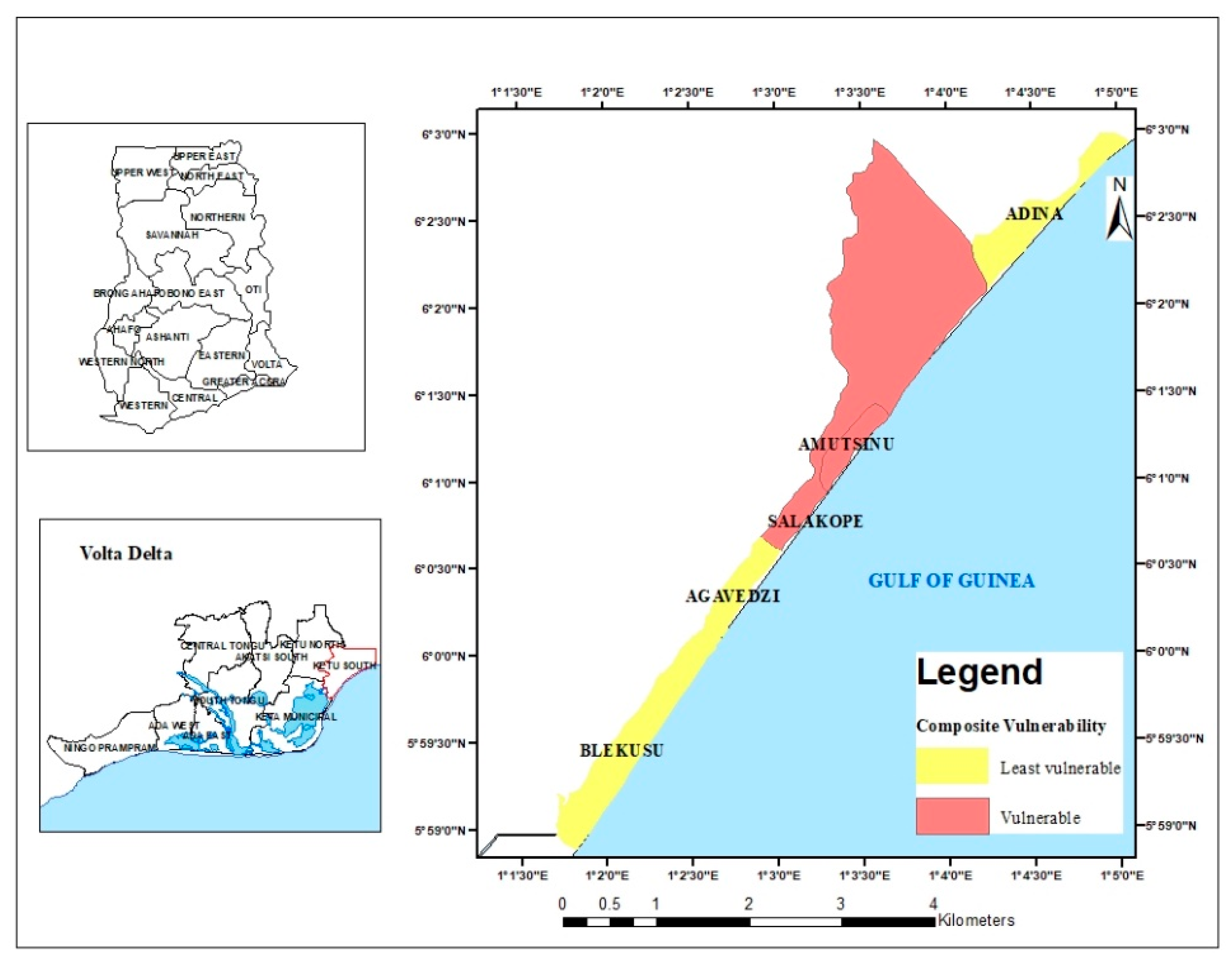 - Osman, A.; Nyarko, B.K.; Mariwah, S. Vulnerability and risk levels of communities within Ankobra estuary of Ghana. Int. J. Disaster Risk Reduct. 2016, 19, 133–144. [Google Scholar] [CrossRef]