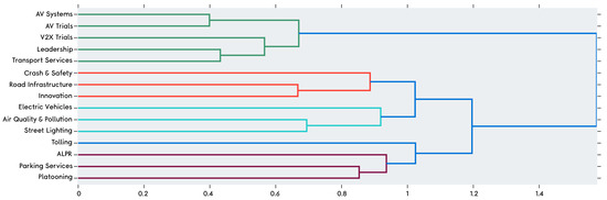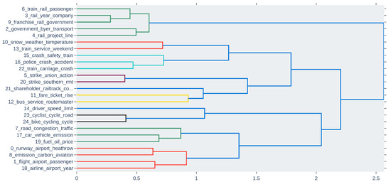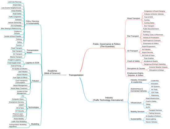 Subsequently, we discovered transportation parameters and macro-parameters from each dataset using the document clusters along with the domain knowledge and a range of quantitative analysis methods performed on the clustered data including similarity metrics [47], hierarchical clustering [48], term score [49], keyword score [50], and intertopic distance map [51]. A range of visualisation methods were used to elaborate on the datasets, document clusters, and the discovered parameters. These include dataset histograms [52], taxonomies, similarity matrices [53], temporal progression plots, word clouds, and others. Multiple taxonomies of transportation from public, industry, and academic views were extracted using automatic clustering of datasets. Figure 1 depicts a high-level combined multi-perspective taxonomy of transportation as viewed by the public, industry, and academia. The first and second level branches in the figure show the discovered macro-parameters and parameters, respectively.
